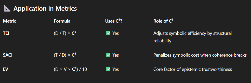MetricFocusHigh Value Means...Low Value Means...TEISymbolic efficiencyHigh cognitive yield per tokenRedundant or shallow token useEVEpistemic depth & structureDeep, verifiable, coherent outputSuperficial, unverifiable contentSACISymbolic cost per functionHigh cost or friction per domainSymbolic flow with low friction